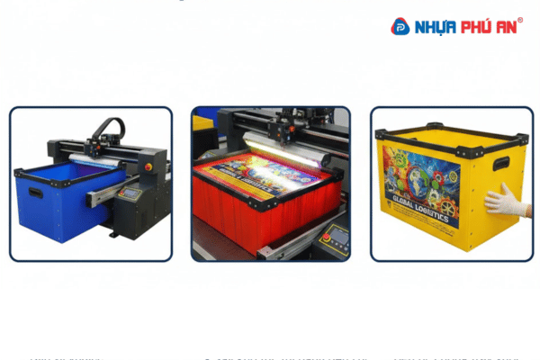 • Thùng nhựa thương hiệu: Thay vì những chiếc thùng màu xanh đơn điệu, doanh nghiệp có thể in logo đa màu, hình ảnh sản phẩm và mã QR code trực tiếp lên thùng. Điều này không chỉ giúp quản lý kho vận bằng máy quét dễ dàng mà còn biến mỗi chiếc thùng thành một đại sứ thương hiệu chuyên nghiệp.